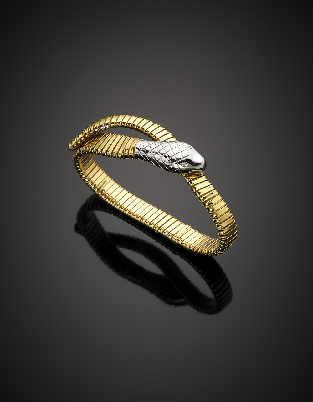 Bracciale tubogas in oro bianco e giallo a guisa di serpente rifinito con due diamanti, g 38,38, lungh. cm 18,50 circa. Firmato MISSIAGLIA WEINGRILL.
