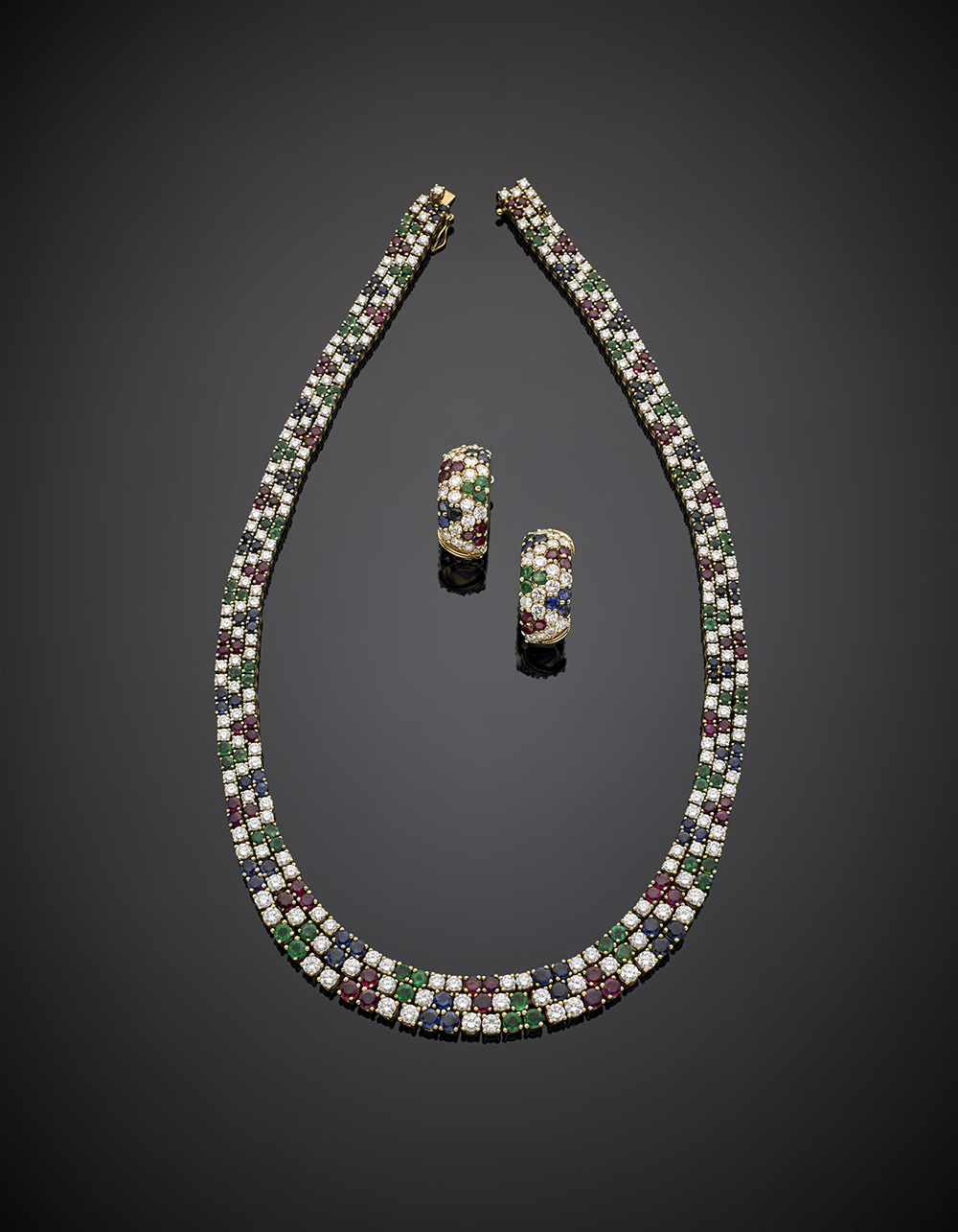 Demi-parure in oro giallo, composta da collier ed orecchini a lobo, con diamanti, zaffiri, rubini e smeraldi, complessivi g 86,59. (lievi difetti e mancanze)