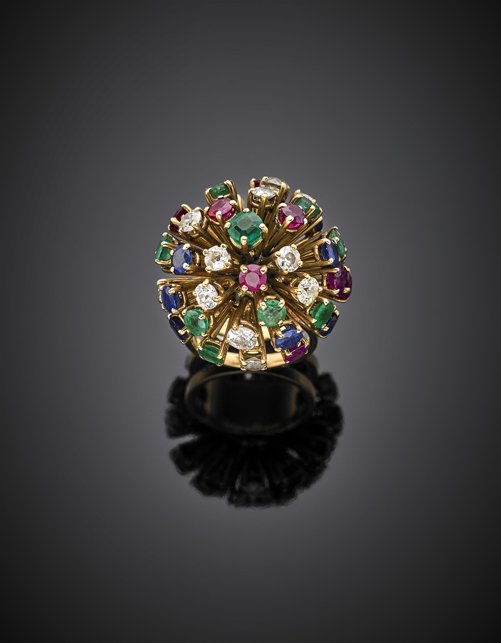 Diamond, ruby, sapphire and emerald "big bang" yellow gold ring, g 25.20 size 12/52.
