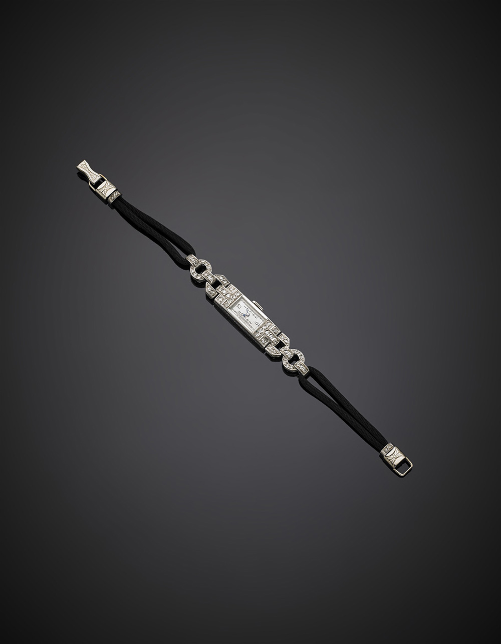 Orologio da polso da donna in platino, diamanti, bracciale in tessuto rifinito con chiusura in oro bianco g 15,20, lungh. cm 15,50 circa.