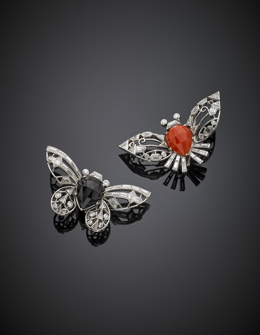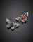 Orecchini a lobo a guisa di farfalla con diamanti di varie forme e due cabochon in corallo ed onice, g 28,66. Firmati FARAONE. In scatola originale