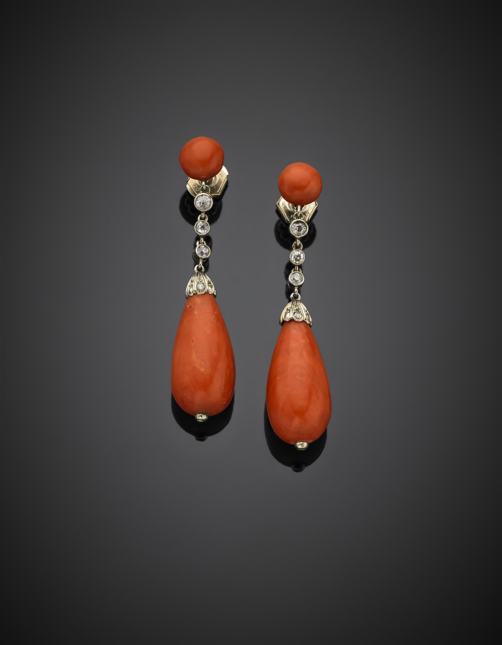 Orange coral drop and cabochon white gold ear pendants accented with diamonds, g 12.01, length cm 5.10 circa.