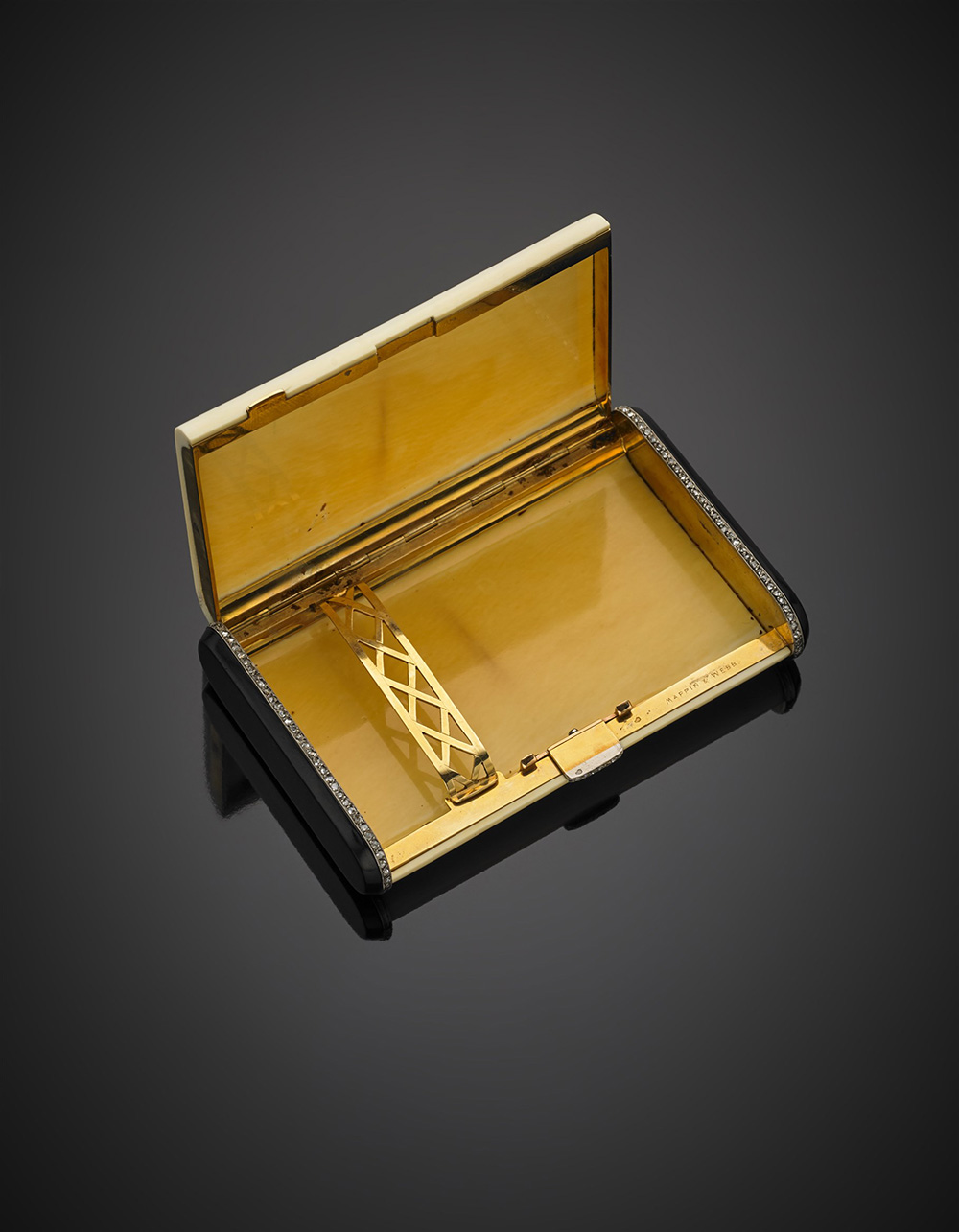 Ivory and onyx yellow gold cigarette-case, white gold and rose cut diamond details, size cm 9 x 5,8x1,3, g 110.79. French Hallmarks, SM.