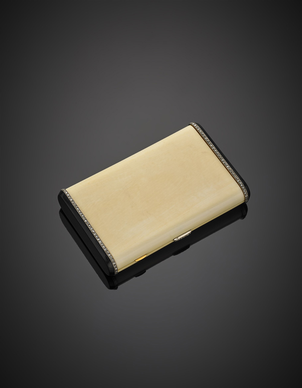 Portasigarette in oro bianco e giallo, rifinito in avorio, onice e osso, con diamanti a mezza rosetta, marchi francesi, misure cm 9 x 5,8x1,3, g 110,79. Marchi Francesi, SM.