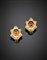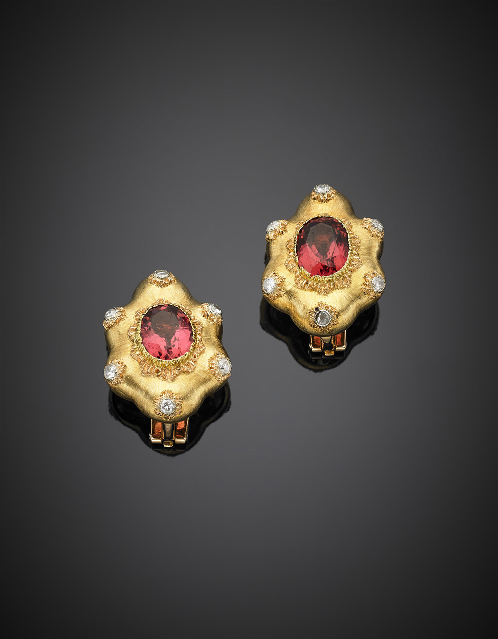Pink oval tourmaline and diamond yellow gold earclips with the classic silky finish, g 18, length cm 2.70 circa.