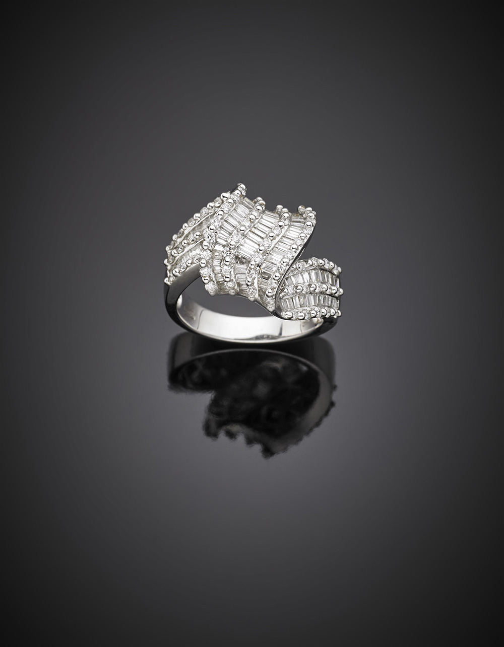 Lotto 1118 | Anello in oro bianco a nastro con diamanti baguette e tapered, g 9,30 misura...