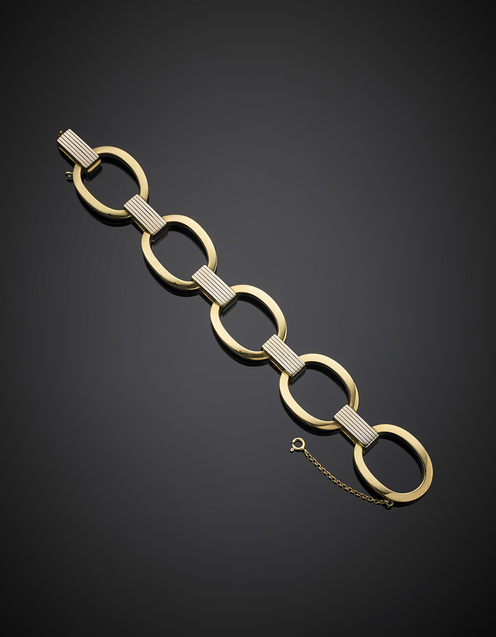 Bracciale ad anelle in oro giallo tenute da passanti in oro bianco rigati, catena di sicurezza, g 97,46, lungh. cm 19,10 circa.