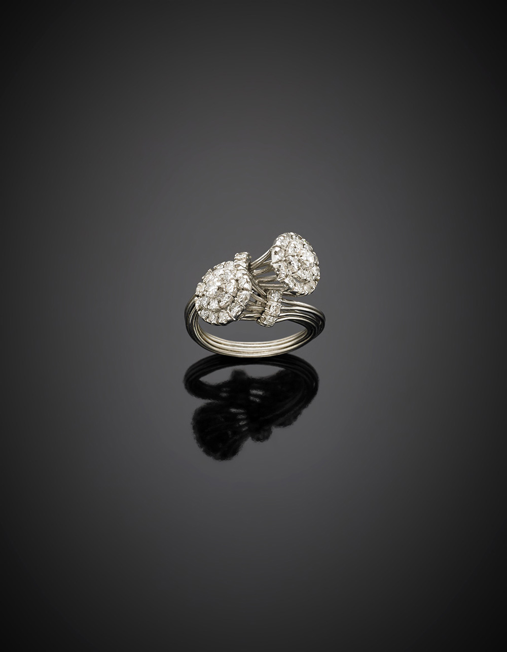 Anello a contrariè in oro bianco con gambo a più fili rifinito con diamanti rotondi, g 7,26 misura 11/51.