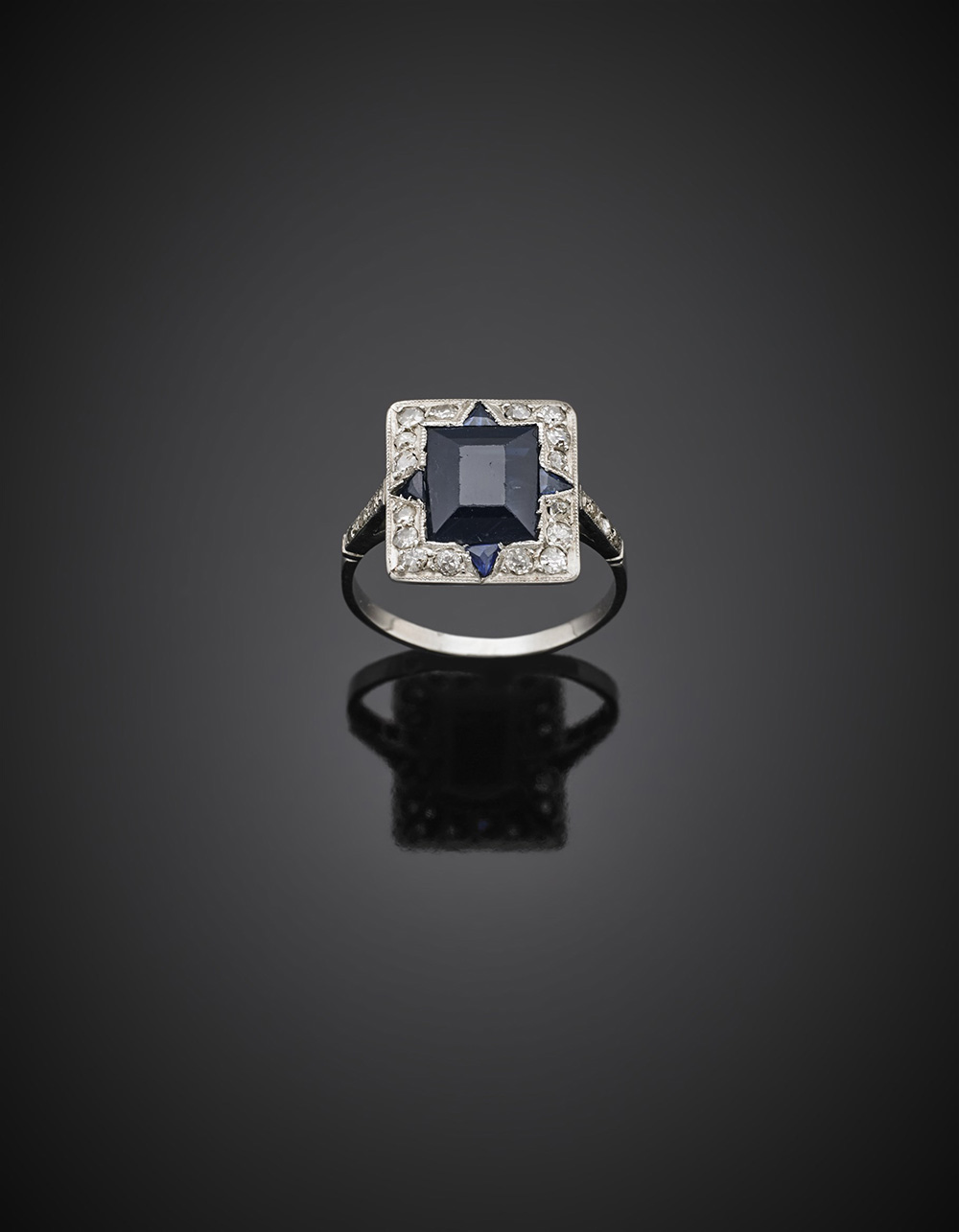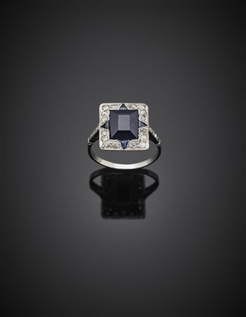 Anello in platino con zaffiro rettangolare di ct. 2,94 circa, diamanti e zaffiri triangolari a definirlo , g 4,01 misura 13/53.