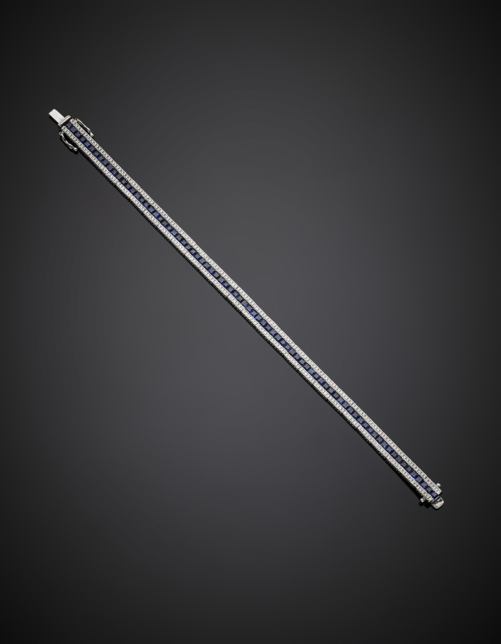 Bracciale in oro bianco, diamanti rotondi e zaffiri carrè, g 17,06, lungh. cm 18,70 circa.