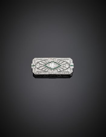 Broche rettangolare in oro bianco con diamanti a cuscino, huit-huit, baguette e triangolari e smeraldi calibré, g 10,80, lungh. cm 4,20, h cm 1,80 circa.