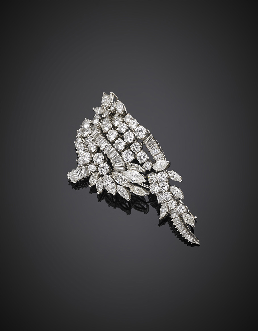 Broche pendente in oro bianco con diamanti rotondi, marquise e tapered per complessivi ct. 15 circa, g 20,49, lungh. cm 6,80 circa.