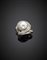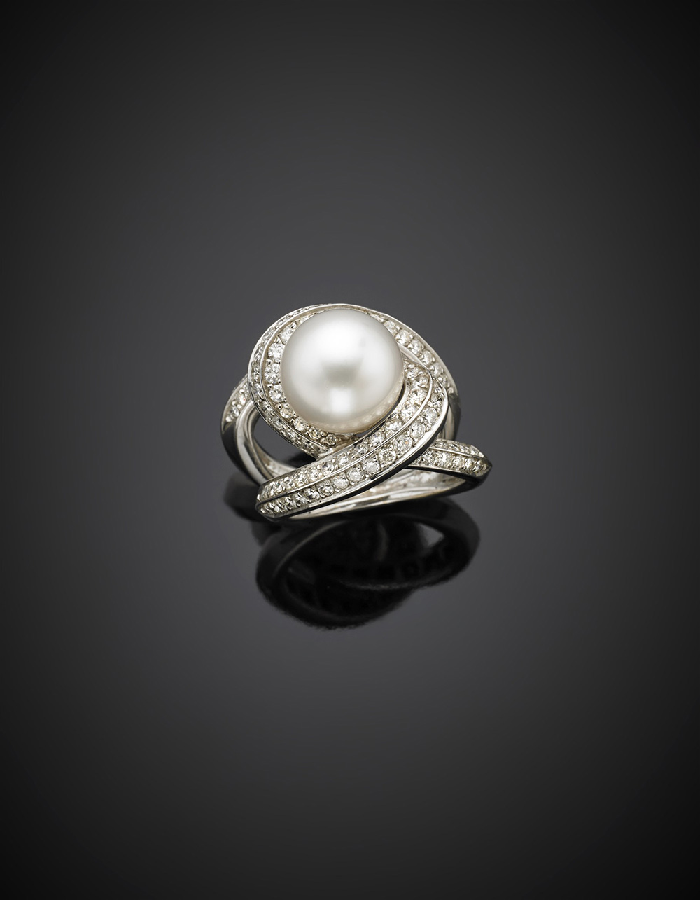 Anello a volute sagomate in oro bianco con diamanti rotondi a contornare una perla South Sea di mm 11,5/12, diamanti per complessivi ct. 0,90 circa, g 19,85 misura 13/53.