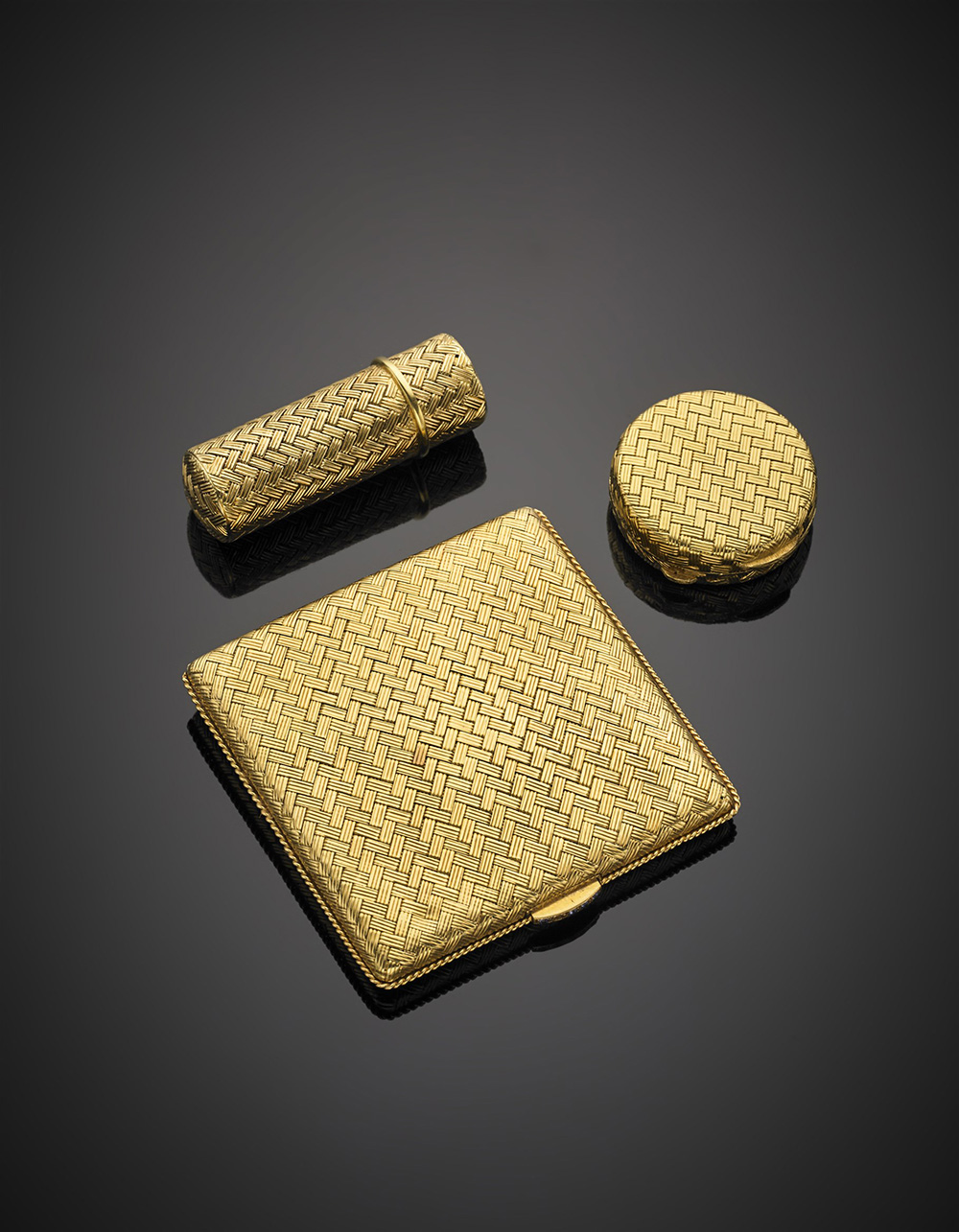 Set composto da portacipria, portapillole e porta rossetto in oro giallo intrecciato a cesto, il portacipria con specchio e chiusura rifinita con zaffiri rotondi, lordi complessivi g 201,35. (mancanze)