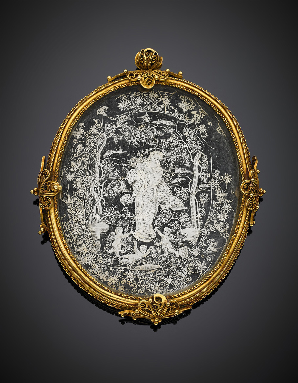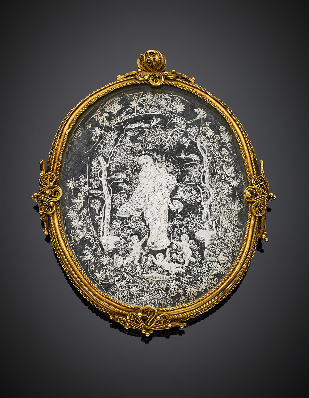 Grande pendente in filigrana d'oro giallo a titolo maggiore di 916/1000 che incornicia un finissimo intaglio in carta della tecnica francese del "Canivet" del XVII secolo tipica dell'area sud-orientale della Francia raffigurante la Vergine Maria sorretta da cherubini, protetto tra due vetri, g 174,62, lungh. cm 11,40, largh. cm 9,30 circa. In scatola damascata (lievi difetti)