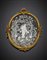 Yellow gold filigree pendant with a "Canivet" religious paper embroidery between two glass, France XVII century, g 174.62, length cm 11.40, width cm 9.30 circa. In damask case (slight defects)