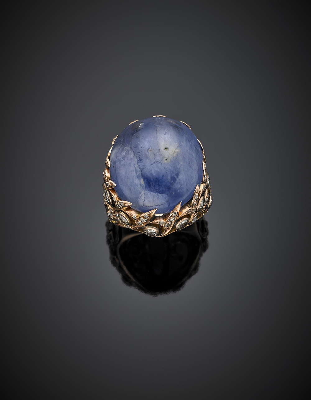 Anello in oro rosso a cupola con diamanti e zaffiro cabochon ovale di ct. 39,50 circa, g 21,35 misura 14/54.