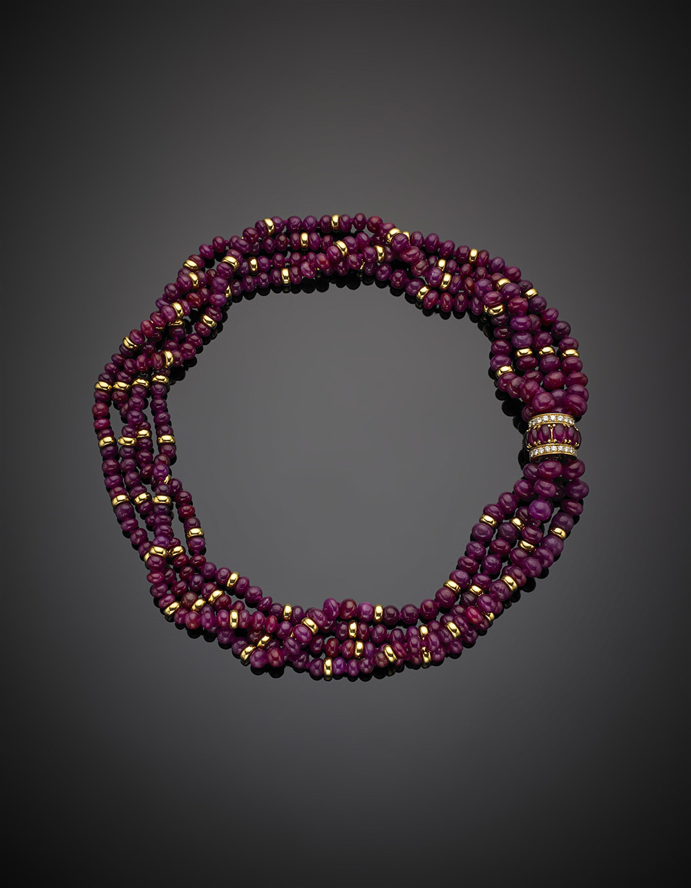 Collier torchon a quattro fili in boules di rubini con distanziatori in oro giallo come la chiusura rifinita in diamanti e rubini cabochon, g 123,88, lungh. cm 42,50 circa. Firmata MISSIAGLIA.