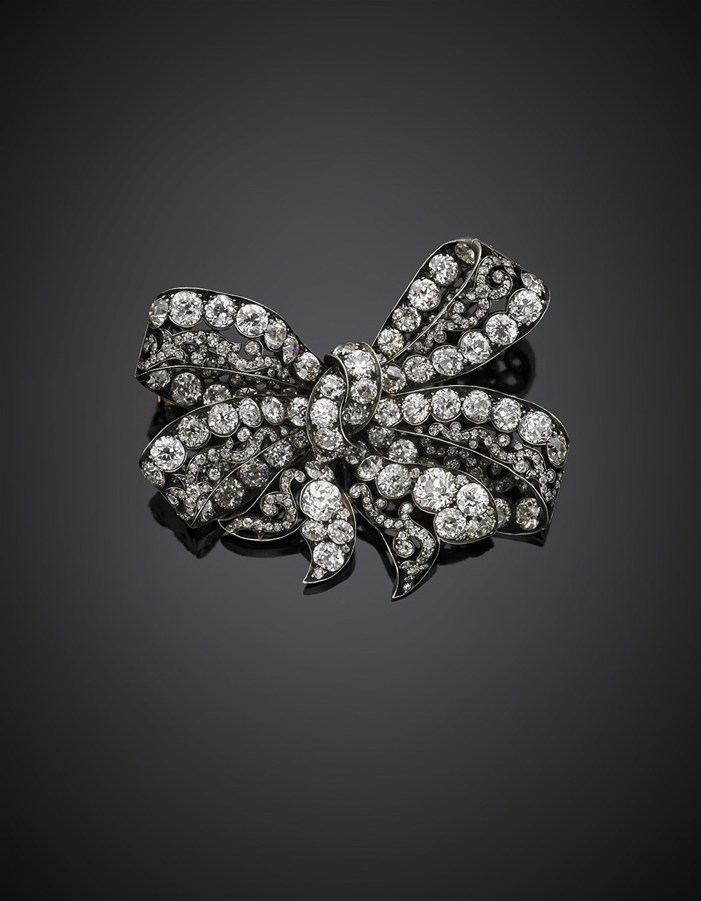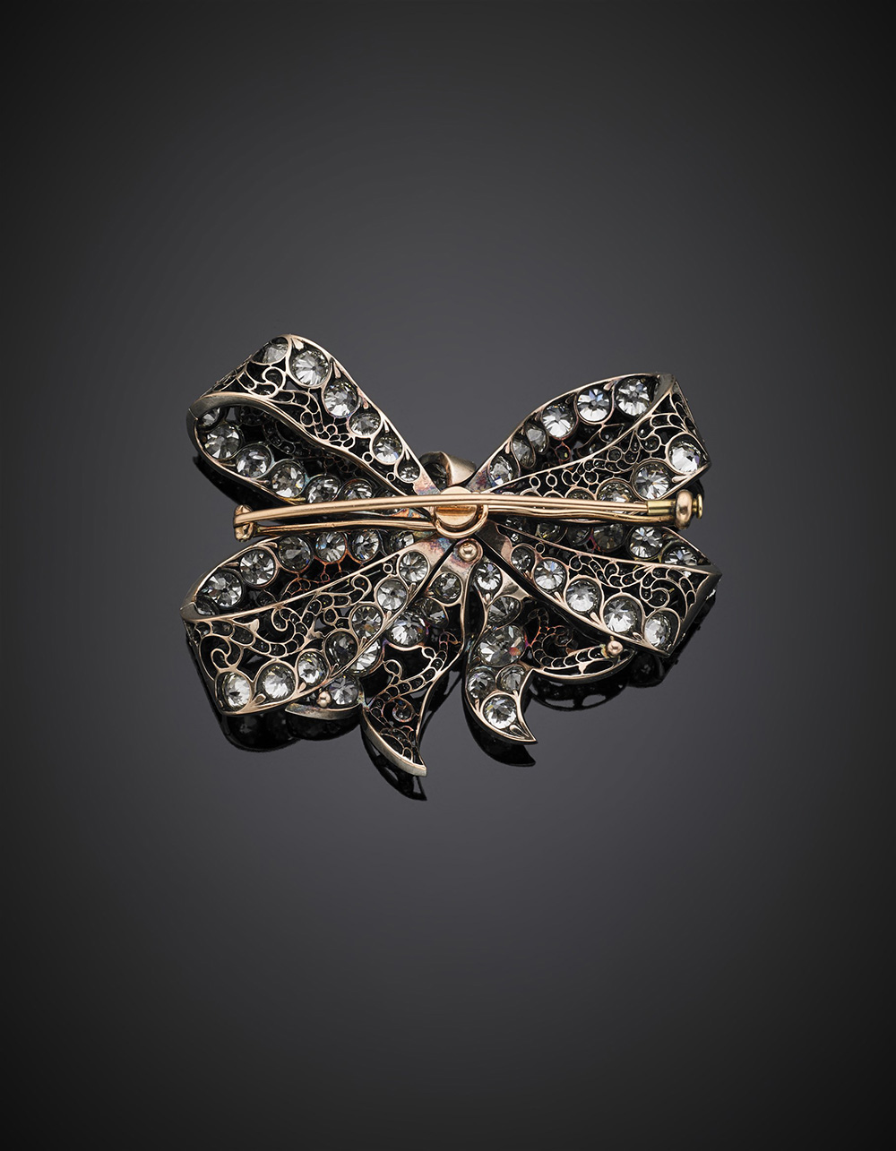 Broche in oro rosso e argento a guisa di fiocco a quattro occhielli con diamanti a cuscino e rotondi taglio vecchio europeo per complessivi ct. 29 circa, g 49,61, lungh. cm 7, h cm 5,60 circa.