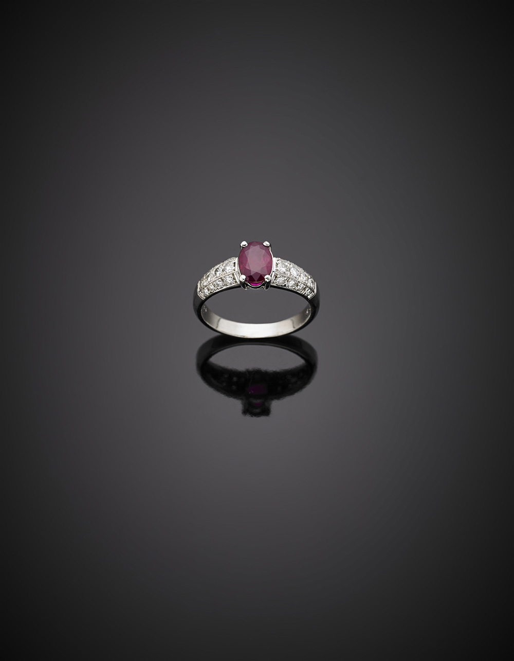 Anello in oro bianco con diamanti a pavé sul gambo e al centro un rubino ovale, g 5,84, lungh. cm 14/54 circa.