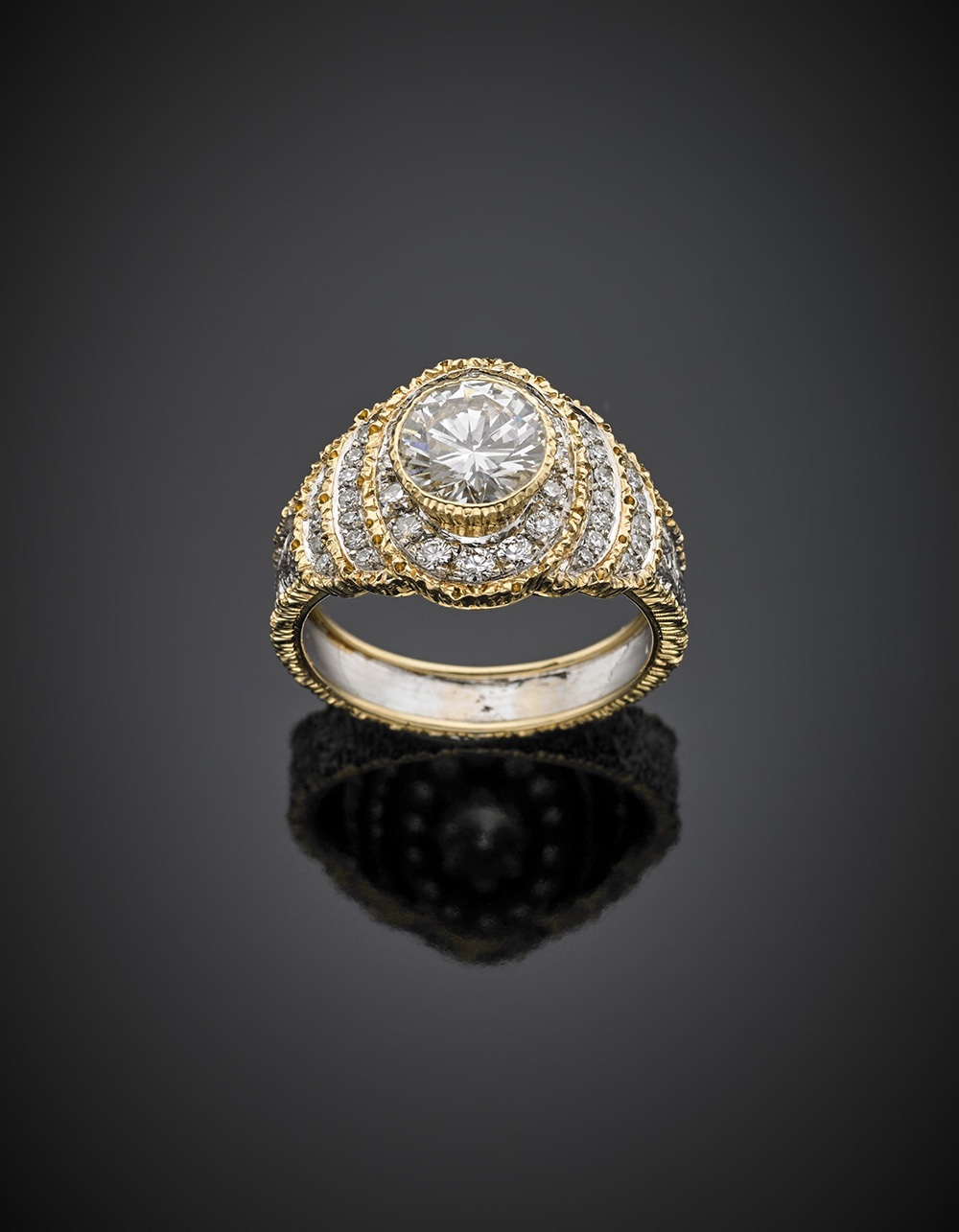 Anello in oro bianco e giallo, tipica lavorazione a pizzo con diamanti rotondi a circondare un diamante centrale rotondo, taglio a brillante di ct. 2 circa, g 8,72 misura 21/61.