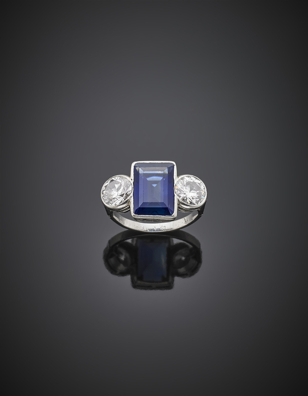 Anello in platino con due diamanti rotondi taglio a brillante vecchio europeo ai lati di uno zaffiro Kashmir di ct. 8,10 circa, diamanti per complessivi ct. 3,08 circa, g 7,90 misura 11/51.