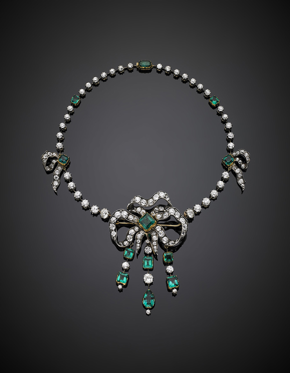 Demi-parure composta da collier e orecchini pendenti in oro e argento diamanti rotondi e a cuscino, smeraldi carré, rettangolari, a goccia con centrale a fiocco nappato utilizzabile come broche, nappe staccabili, diamanti per complessivi ct. 35 circa, smeraldi per complessivi ct. 31 circa g 64,51, lungh. cm 41,50 circa.
