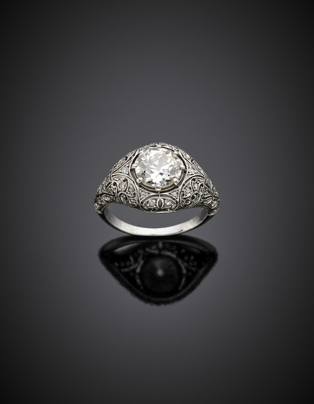 Round ct. 1.60 circa old european cut diamond platinum openwork ring, g 4.56 size 8.5/48.5.