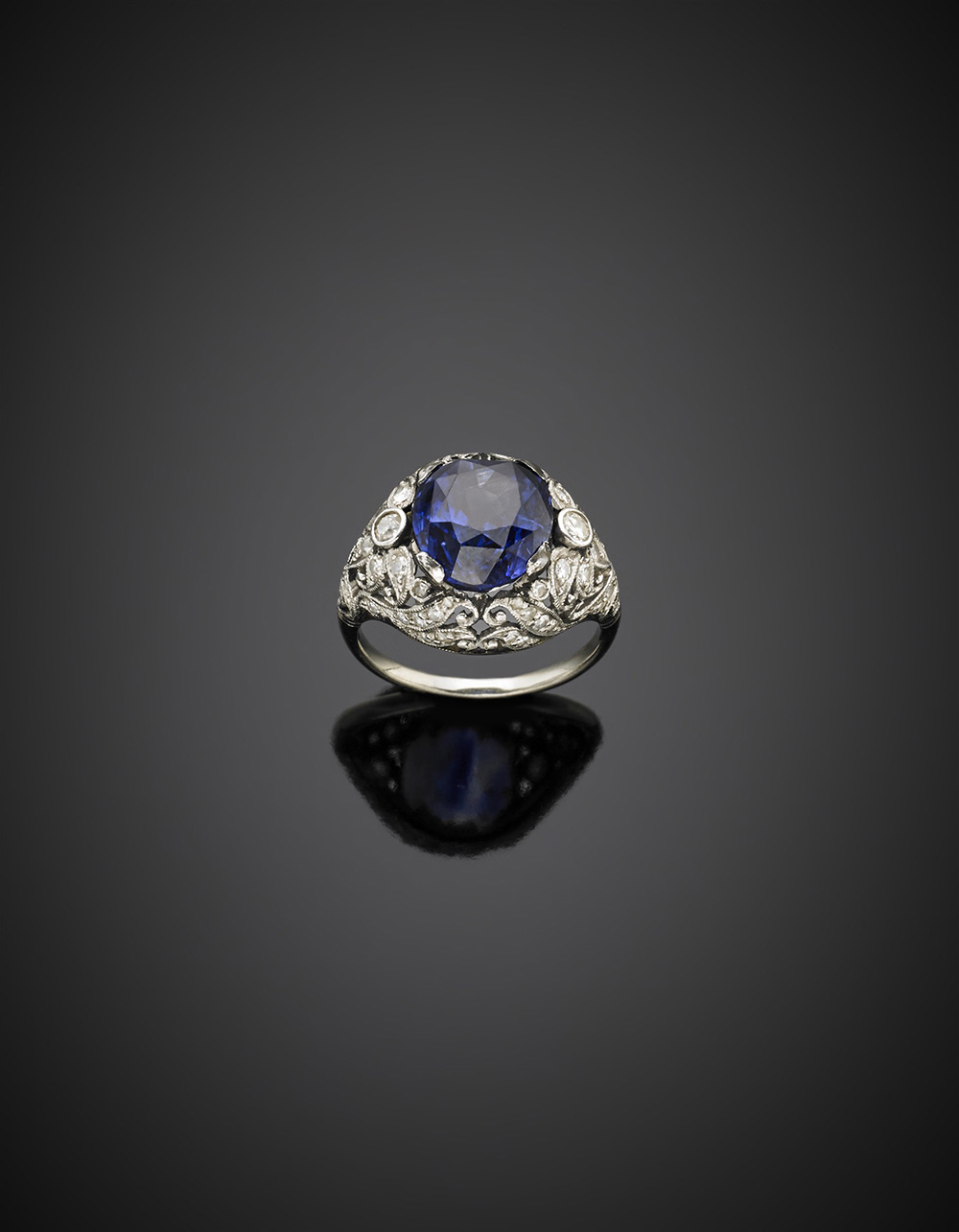 Lotto 1189 | Anello in platino con diamanti a contornare uno zaffiro ovale di ct. 7,50...