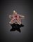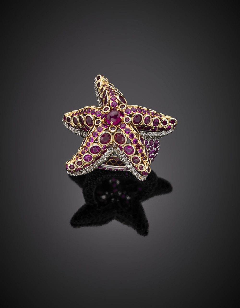 Anello in oro giallo e bianco con pavé di diamanti e rubini a formare una stella marina, rubini a pavé sul gambo sagomato, g 26,77 misura 11/51.