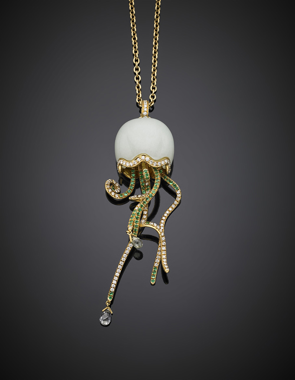 "Marinella maxi" , milk aquamarine bead, briolette corundum, diamond and emerald jellyfish pendant and cm 44 chain, g 43.98, length cm 9.50 circa.