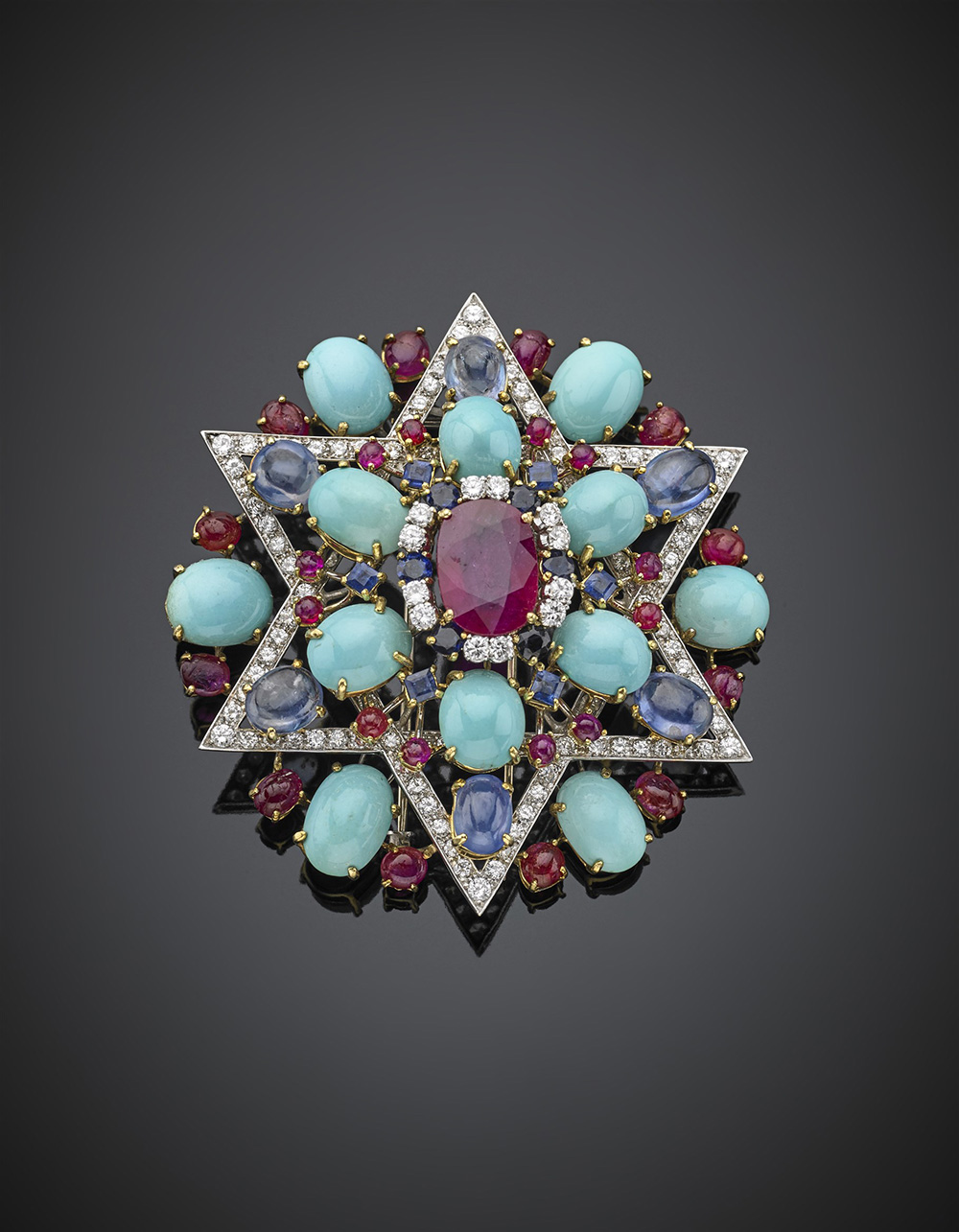 Broche/pendente a guisa di stella in oro giallo e bianco con diamanti, zaffiri, rubini e turchesi, g 54,04, diam. cm 6,50.