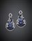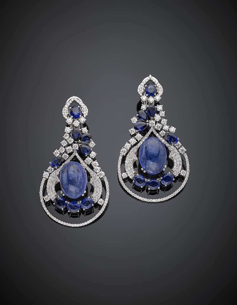Orecchini in oro bianco, diamanti, zaffiri e due tanzaniti cabochon per complessivi ct. 25,17 circa, g 31,98, lungh. cm 5,70, largh. cm 3 circa.