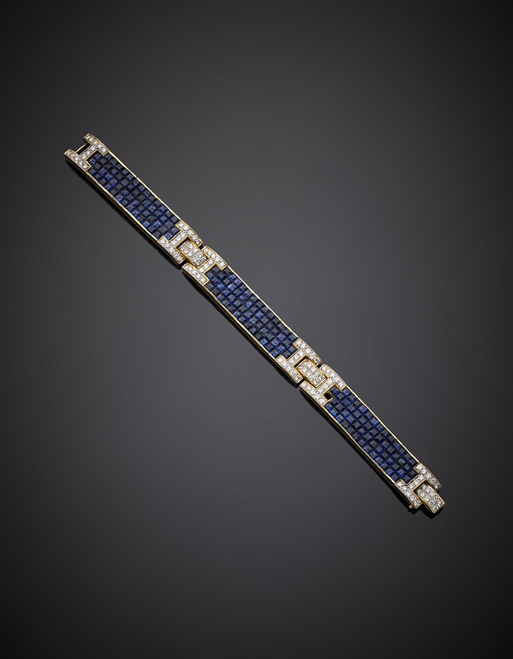 Bracciale in oro giallo con pavè invisible-set di zaffiri carrè rifinito con diamanti, g 47,31, lungh. cm 17,50 circa.