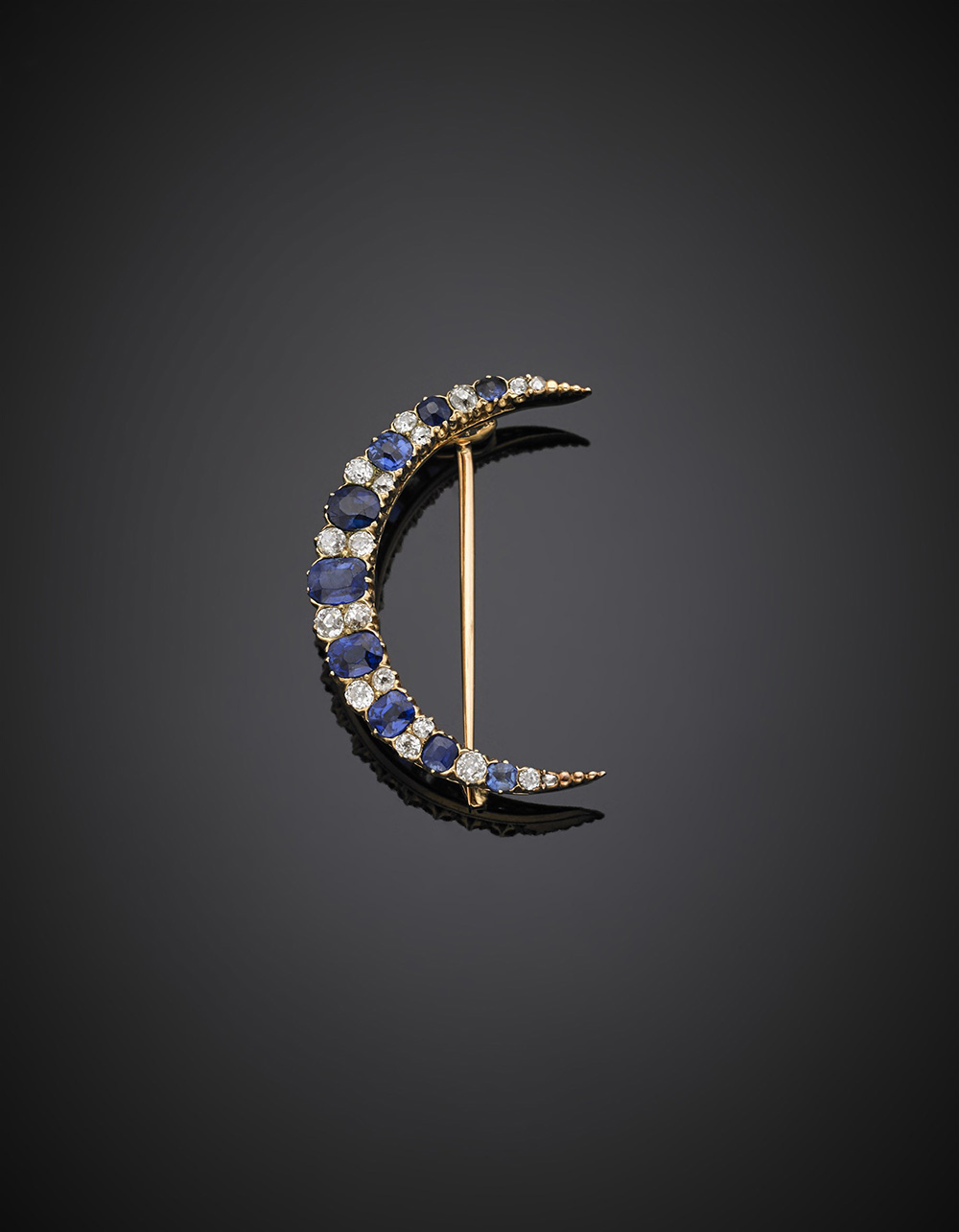 Broche a falce di luna in oro giallo con diamanti rotondi taglio old mine e zaffiri ovali, g 7,58, lungh. cm 3,60, largh. cm circa.