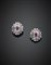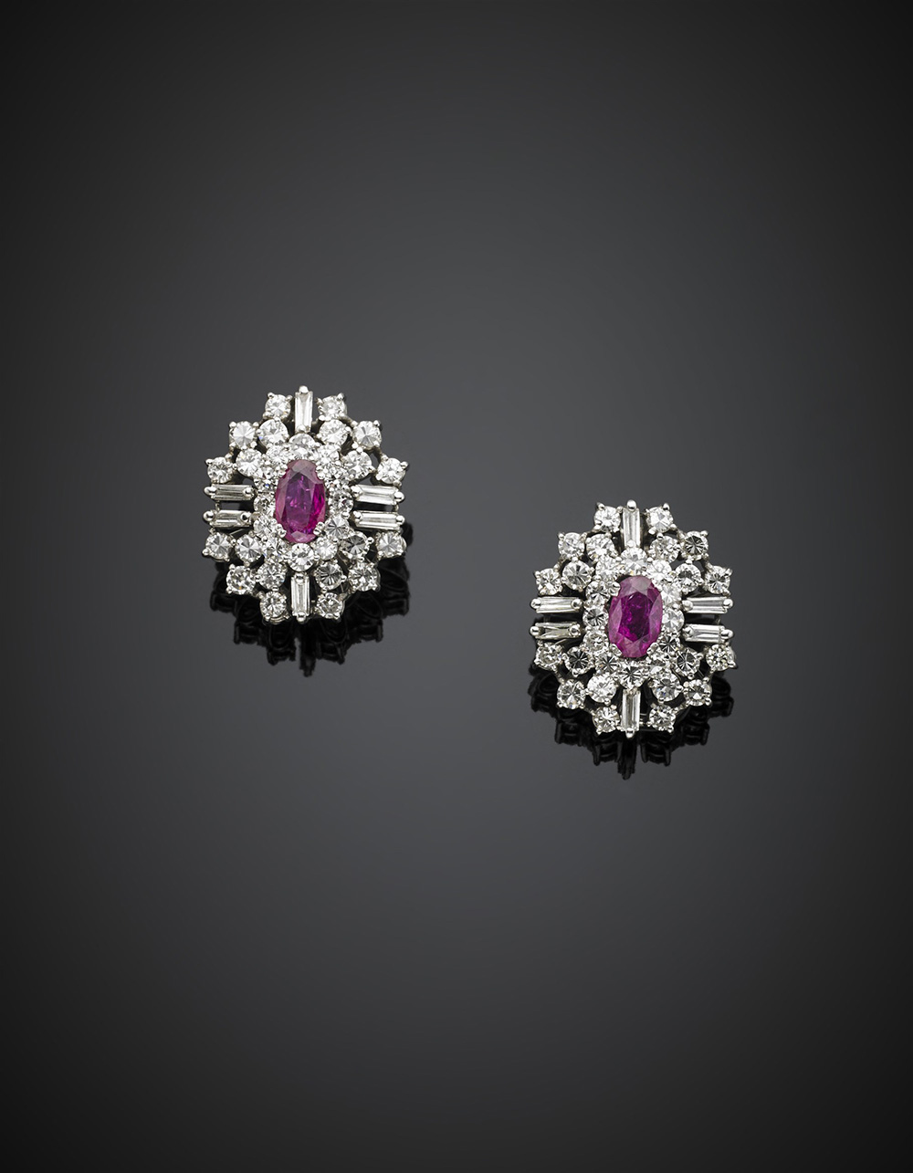 Orecchini a lobo in oro bianco con diamanti rotondi e a baguette per complessivi ct. 3,65 circa a contornare due rubini ovali taglio composito, rubini per complessivi ct. 1,40 circa g 14,62, lungh. cm 2 circa.