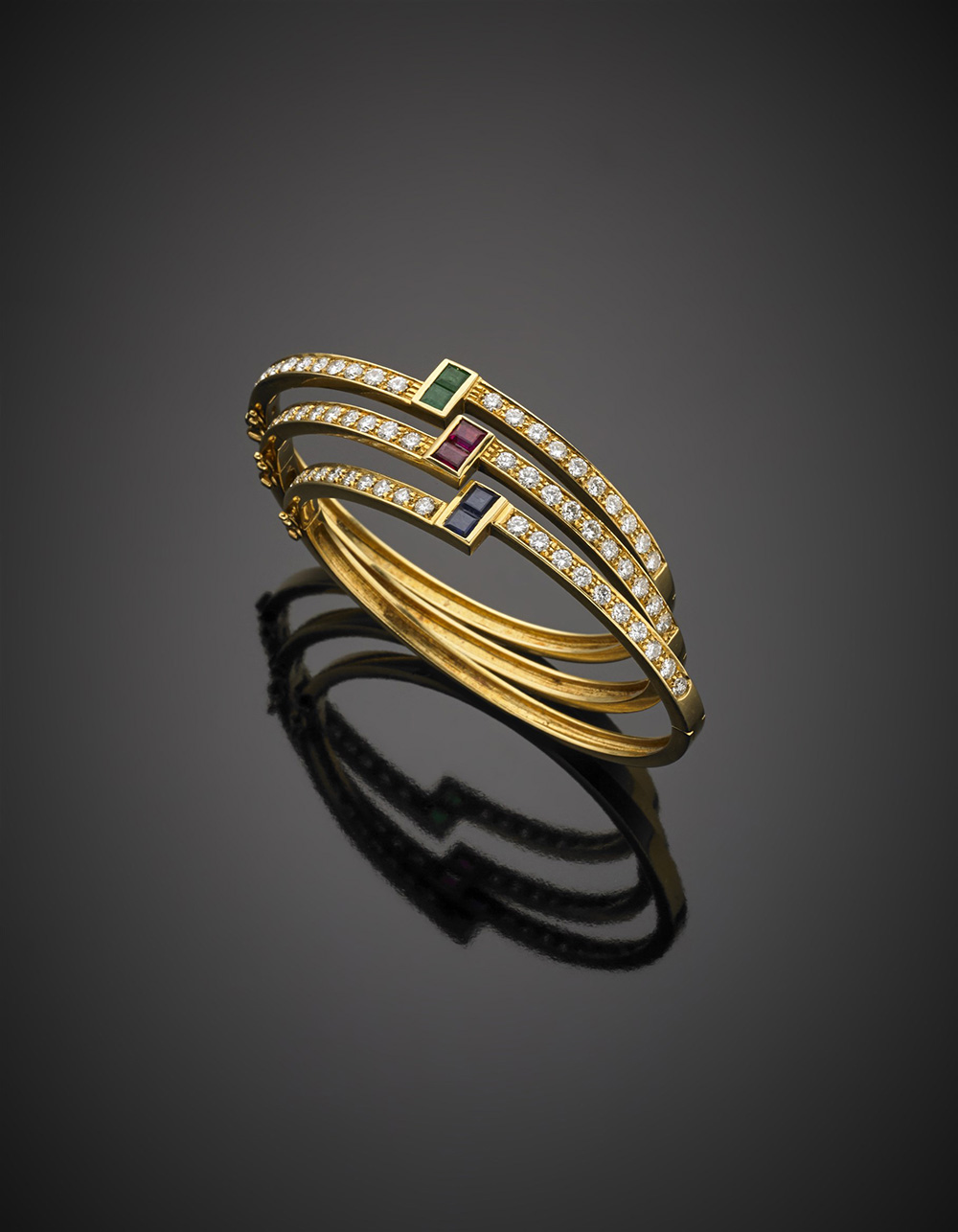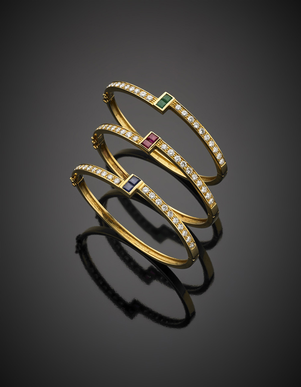 Tre bracciali rigidi in oro giallo, tutti con diamanti rotondi per complessivi ct. 8 circa, rifiniti rispettivamente con rubini, smeraldi e zaffiri carrè, complessivi g 53,89, diam. cm 5,80.