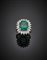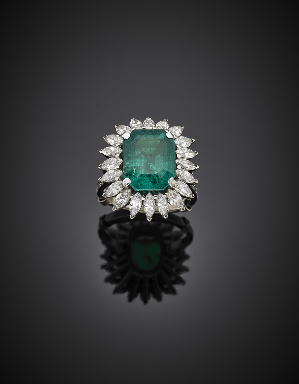 Anello con diamanti a contornare uno smeraldo ottagonale di ct. 6,80 circa, g...