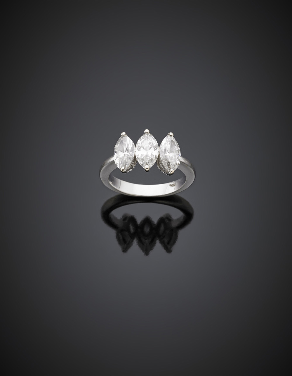 Anello in oro bianco con tre diamanti a marquise per complessivi ct. 2,85 circa, g 5 misura 14/54. In scatola Antognazzi Bassano Gioielli e copia certificato di garanzia annesso