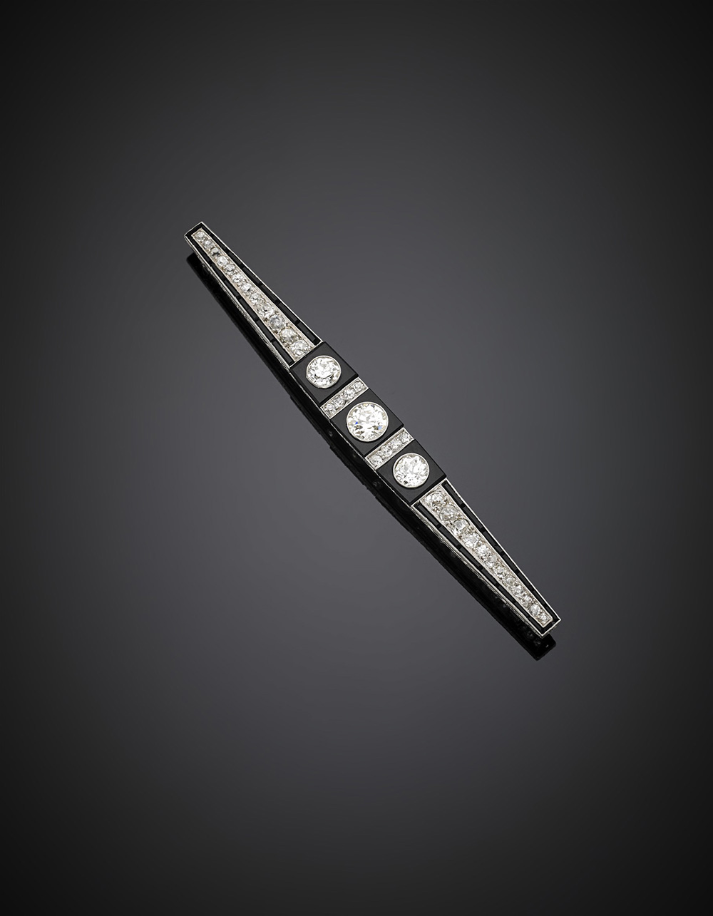 Spilla a barretta in platino, diamanti rotondi per complessivi ct. 2,40 circa, diamanti old mine e onice, g 10,90, lungh. cm 9,10 circa. In scatola originale di Holmes & Co.