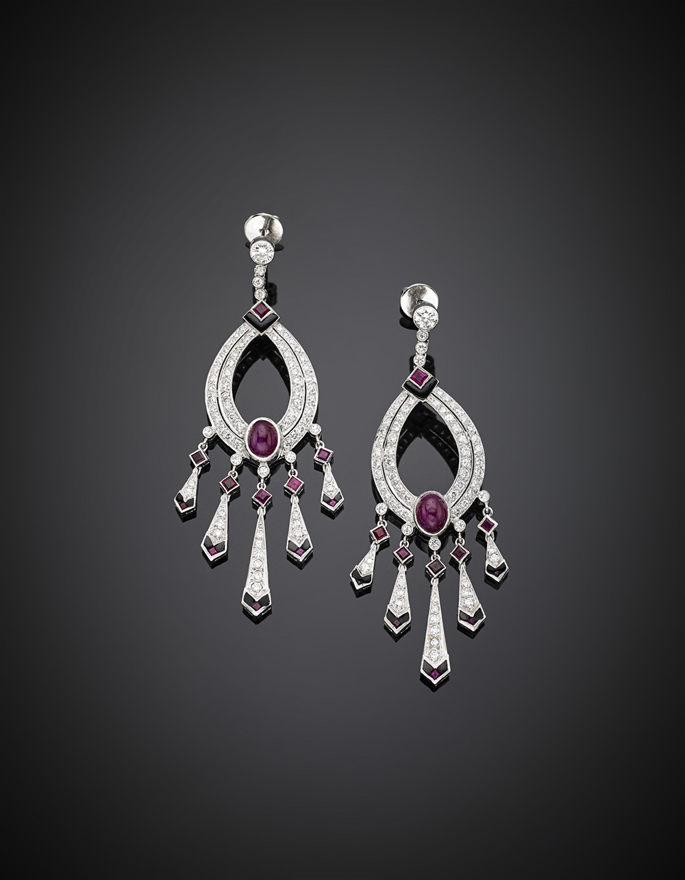 Orecchini pendenti in oro bianco con diamanti rotondi, huit-huit, onice e rubini carré e cabochon, g 16,13, lungh. cm 6,50 circa.