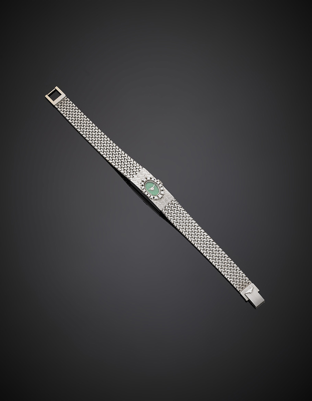 Orologio da polso da donna in oro bianco, rifinito in diamanti e smalto verde per il quadrante, g 35,60, lungh. cm 16,90 circa.
