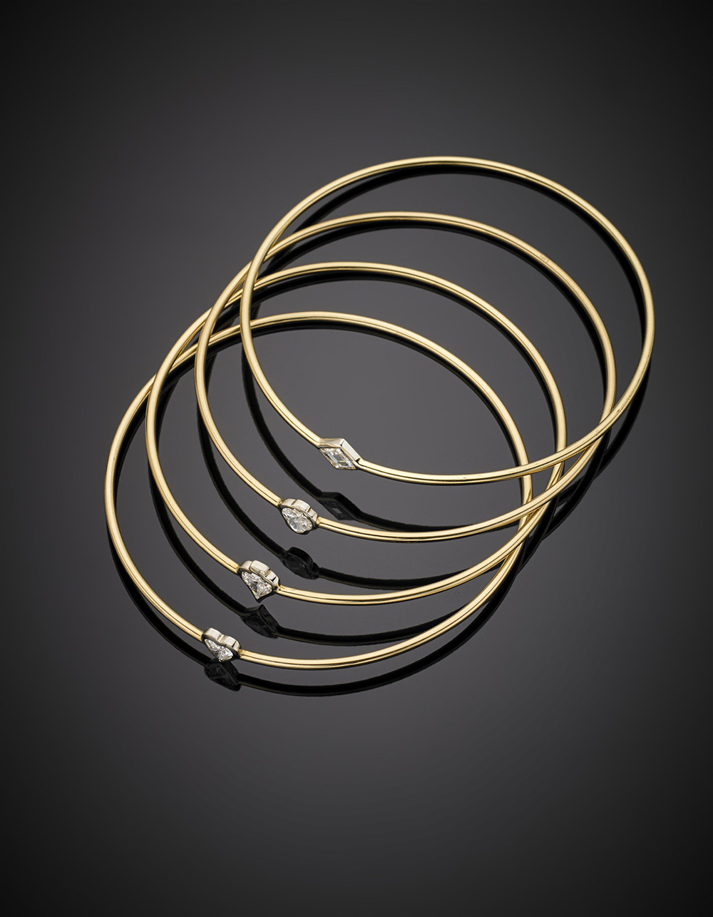 Quattro bracciali a cerchio, rigidi in oro giallo, con diamanti a forma dei...