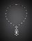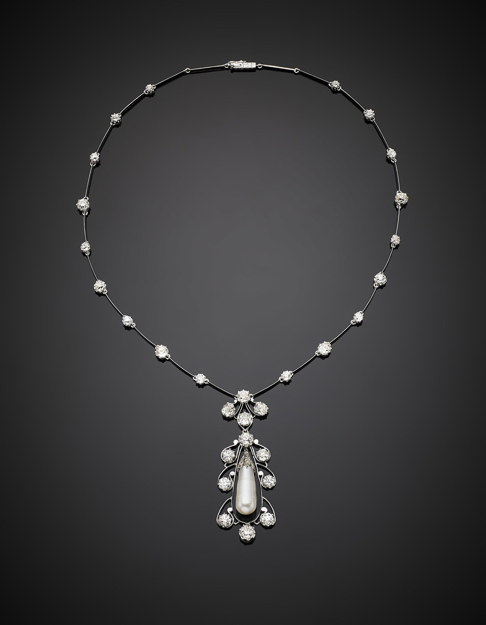 Collier in diamanti rotondi a scalare distanziati da segmenti in oro bianco e con centrale rifinito da una perla a goccia, pendente lungh. mm 19.80 diam. mm 8.26 , diamanti per complessivi ct. 10 circa, g 34,31, lungh. cm 46,30 circa.