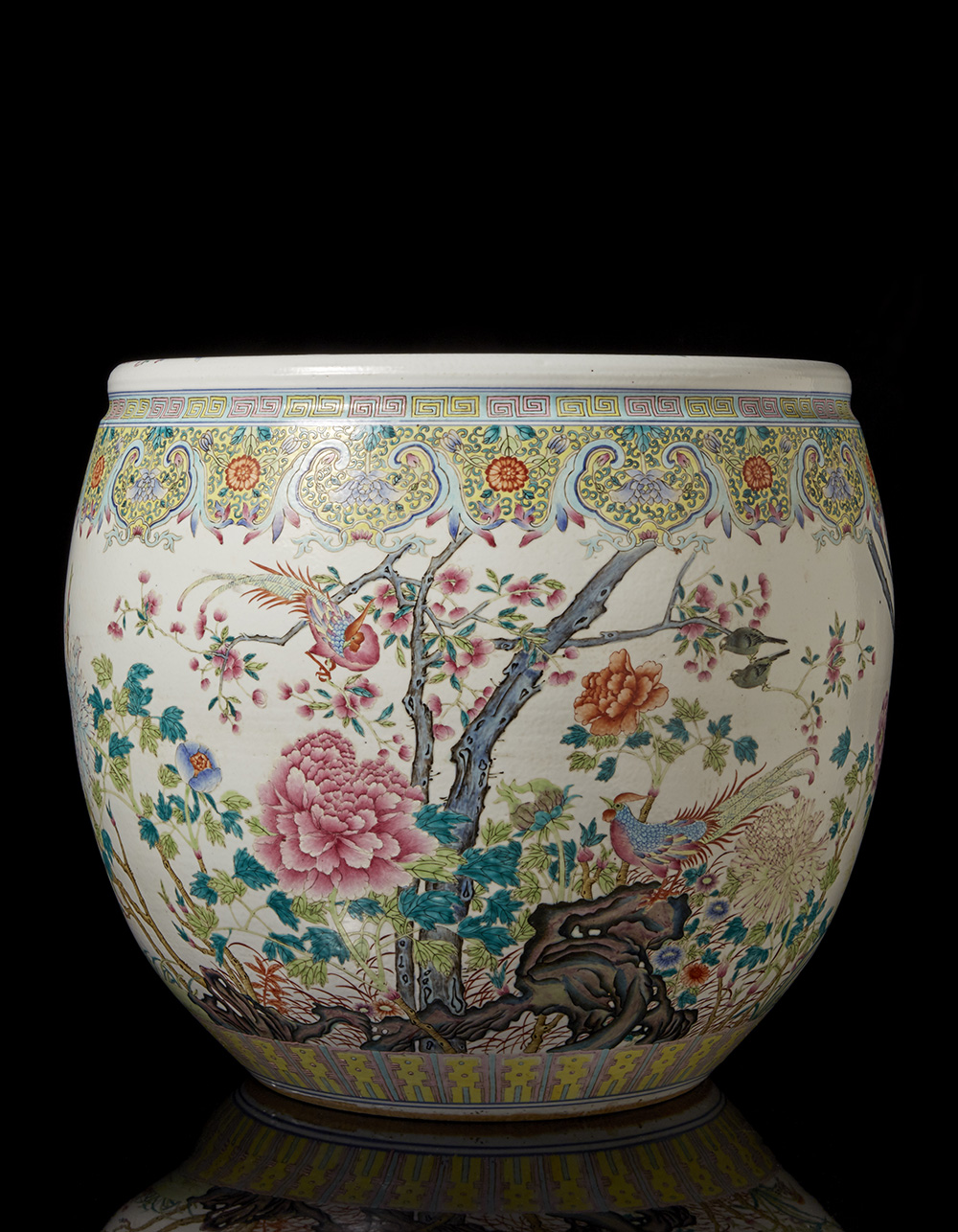 Grande jardiniere in porcellana Famiglia Rosa decorata a fiori e uccelliCina,...