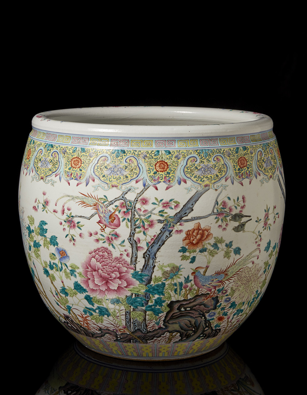 Grande jardiniere in porcellana Famiglia Rosa decorata a fiori e uccelli