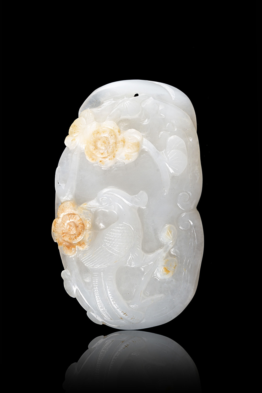 Intaglio in giada bianca raffigurante fenice dalla lunga coda e fiori, alcune inclusioni alla pietra