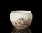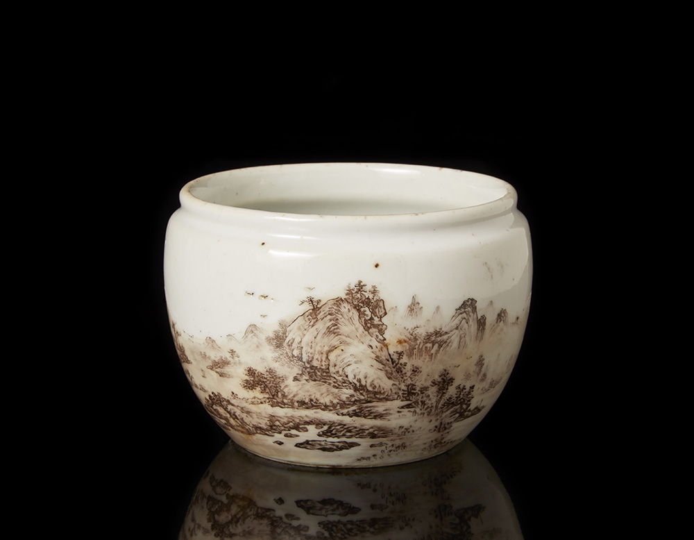 Piccola potiche con decoro in smalti color seppia raffigurante paesaggio con calligrafia
