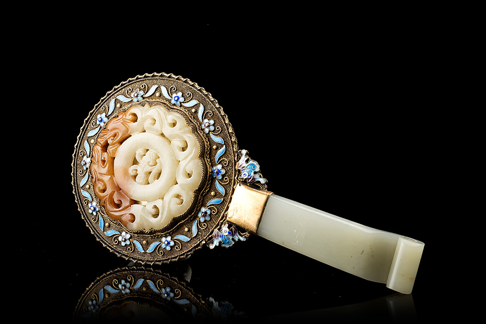 A jade belt hook mounted as a mirror handle, with gilt and enamelled mounts