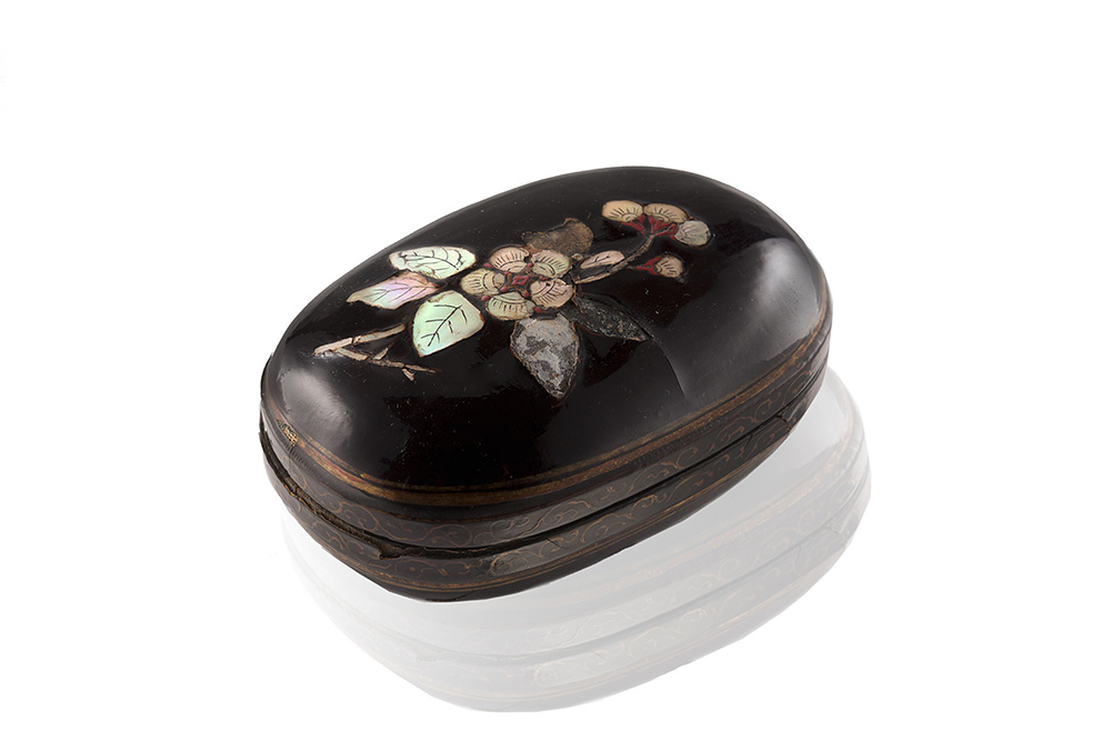 Piccola scatola ovale laccata in nero (luotian) e dipinta in oro (miaojin), il coperchio decorato in madreperla con rami di pruno in fiore, con dettagli in lacca rossa e lumeggiature, il bordo adornato dal classico motivo 'dell'erba profumata' (xiangcao), con contenitore originale (difetti e mancanze)